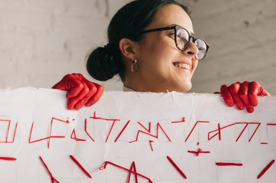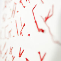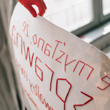 Viktoriia Tofan zajmuje się poszukiwaniem języka, który byłby odpowiedzią na dogłębne poczucie obcości, jakie dzieli z osobami głuchymi, często nie mówiącymi, bądź mającymi problemy z artykulacją. Praca z tą grupą stała się podstawą do stworzenia zarówno nowego alfabetu, jak i nowego języka Te nowe języki to nowe terytoria jej prywatnej ojczyzny, nowej przynależności oraz przestrzenności. Język w tym ujęciu staje się nie tyle nośnikiem informacji, ile miejscem, formacją emocjonalną oraz wspólnotą w ułomności/inności. Owa prywatna ojczyzna jest punktem wyjścia do komunikowania oraz włączania w społeczność historii ludzi, którzy zostali postawieni poza społecznym nawiasem. Tofan używa haftu jako sposobu pracy z językiem wykorzystując zarówno sensualność rzemiosła przypisanego kobietom, jak i graficzność rewersu,który w tym przypadku zaczyna pełnić funkcję awersu.