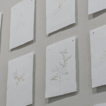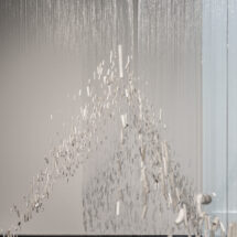 Owo stado ulatujących w górę, odrywających się z papieru ptaków ujęła artystka za pomocą pary wodnej na powierzchni wrażliwej na temperaturę w kolejnej pracy „Flock”.