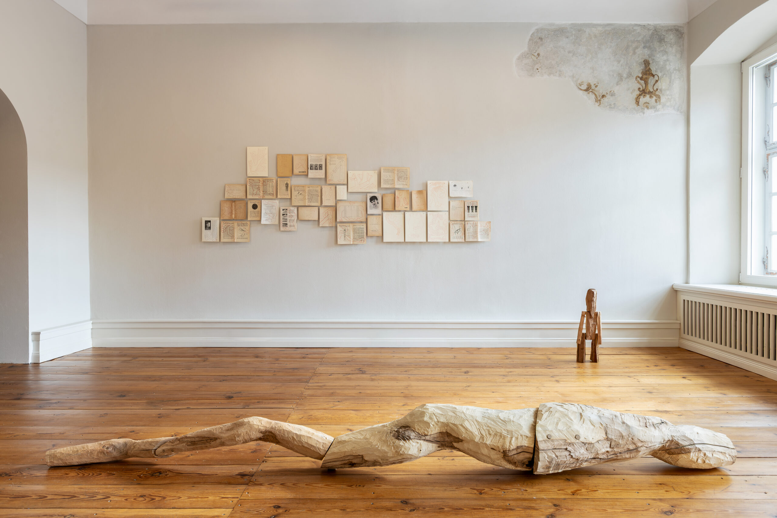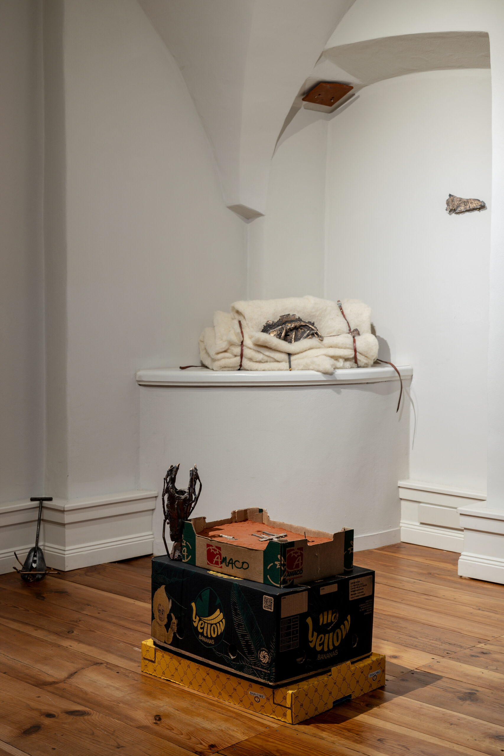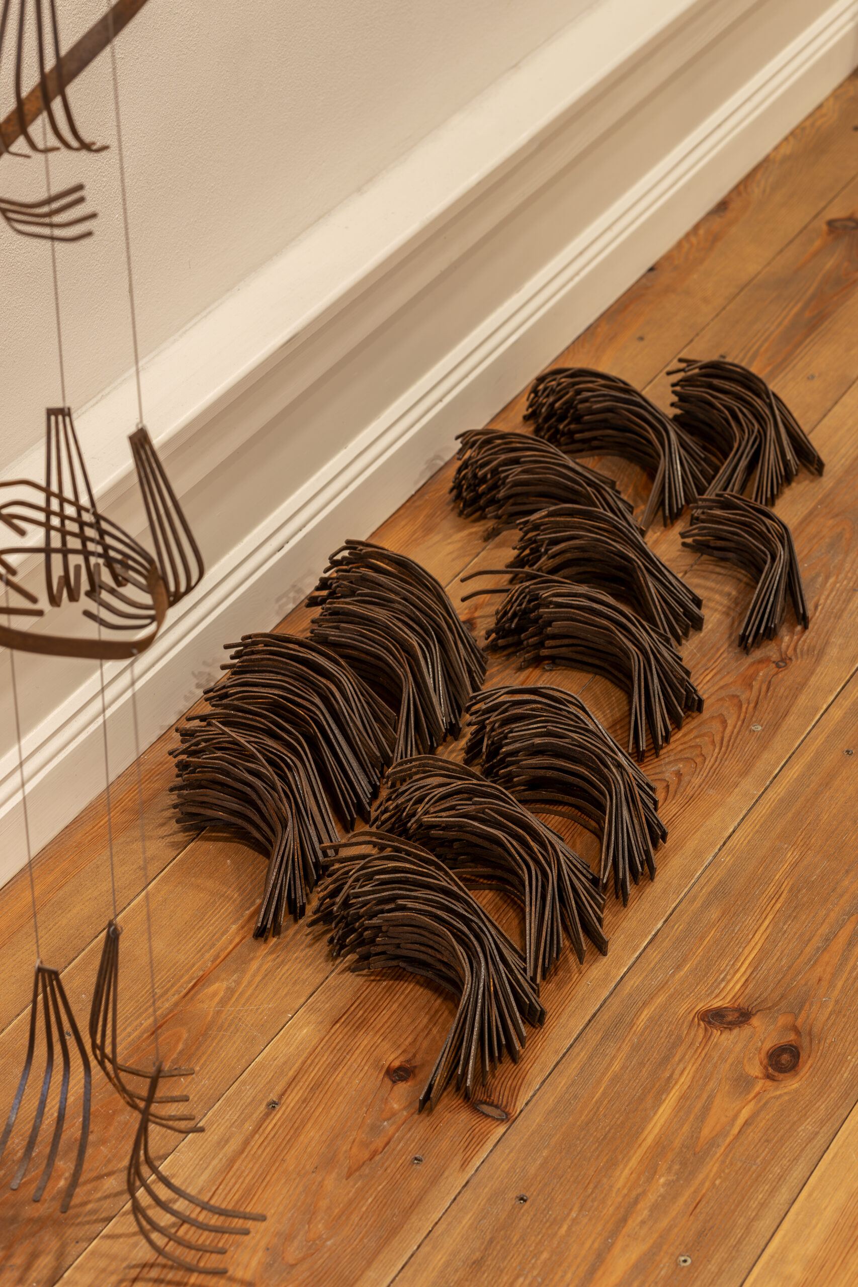 Przykładami takich działań na wystawie jest udzielanie głosu materii, mapowanie wysiłku włożonego we współdziałanie z nią, budowanie archiwum pracy, umacniającej więzi przez wykonywane codziennie choreografie: zbieranie, ścieranie, zszywanie. Temu podskórnemu nurtowi, który zdaje się płynąć przez wszystkie prezentowane prace towarzyszy próba wychwytywania i podkreślania momentów, kiedy język się rozwiązuje, ręce są zajęte, a ciało, skupiając się na znanej czynności, zaczyna się rozluźniać. Myśli płyną wtedy swobodnie, znajdując przestrzeń do łączenia się w historie zawieszone między faktami a domysłami, prawdą materiału a konfabulacją.